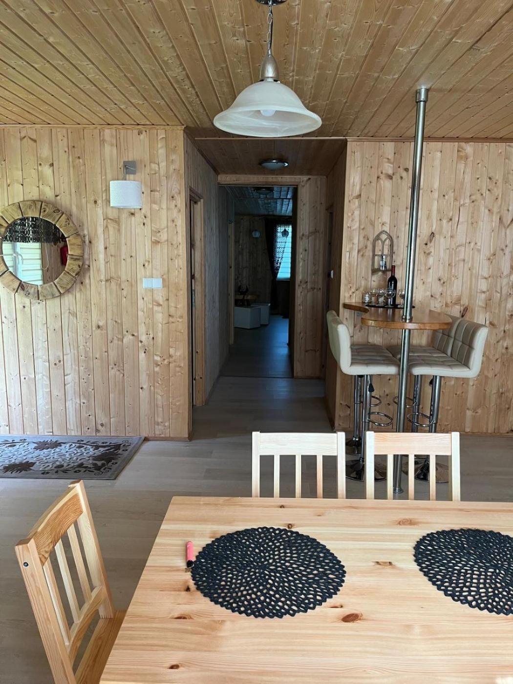Dom z 3 sypialniami. This spacious holiday home consists of 1 living room, 3 separate bedrooms and 1 bathroom with a walk-in shower. Guests will find a stovetop, a refrigerator, kitchenware and an electric kettle in the well-equipped kitchen. The holiday home also offers a barbecue. Featuring a terrace with lake views, this holiday home also provides a seating area and a flat-screen TV. The unit offers 4 beds. Dom wakacyjny - 6 osobowy. Powierzchnia pokoju ok.: 116 mkw.
