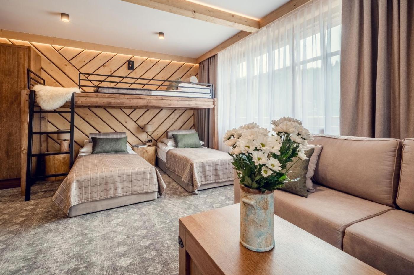 Pokój rodzinny. The family room provides a tea and coffee maker and a wardrobe, as well as a private bathroom featuring a shower. This family room features a carpeted floor, heating, a flat-screen TV and mountain views. Rodzinny - 5 osobowy. Powierzchnia pokoju ok.: 30 mkw.